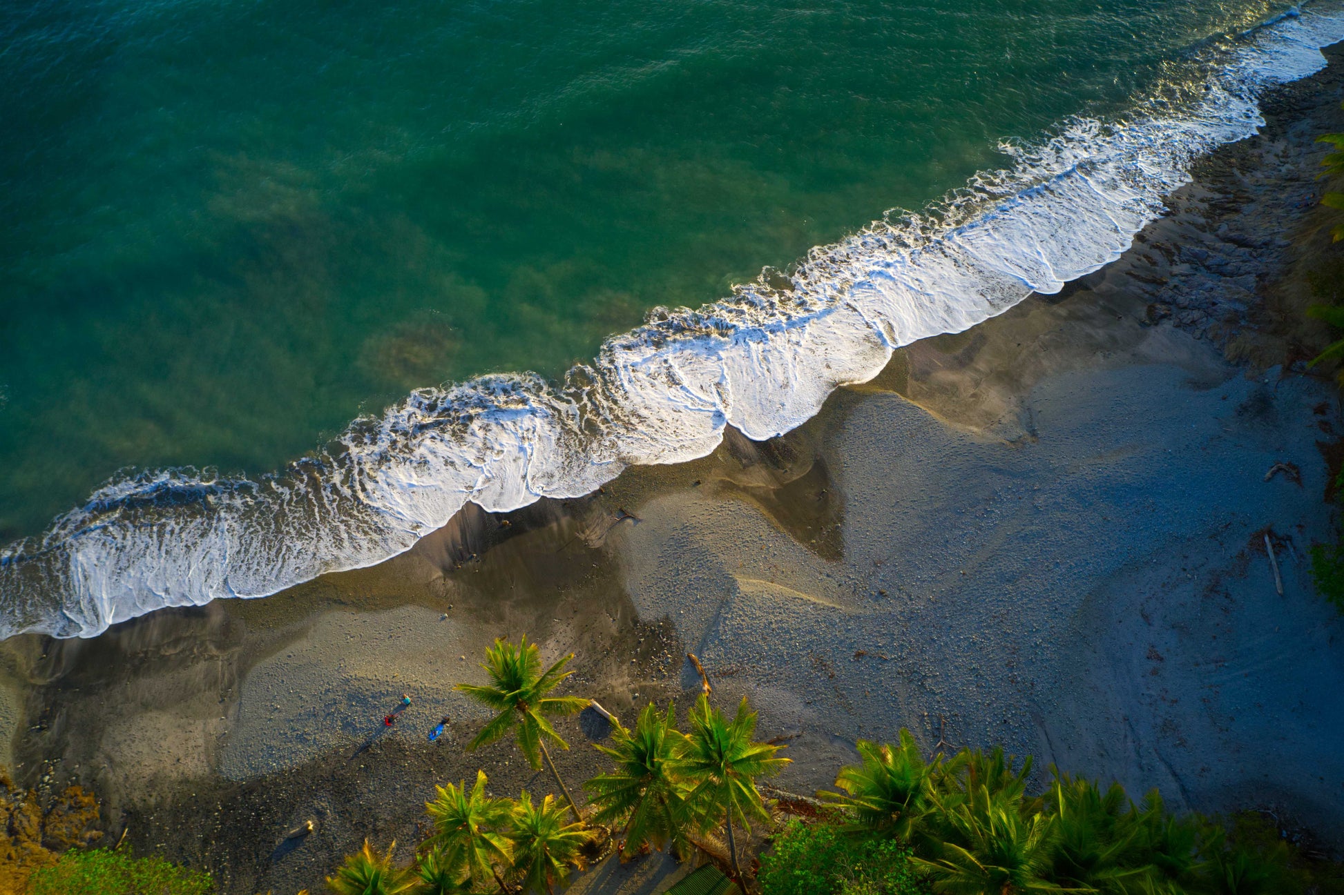 Crystal teal waters glow under the tropical sun, the ocean's glassy surface erupting at the edges into foaming white lace