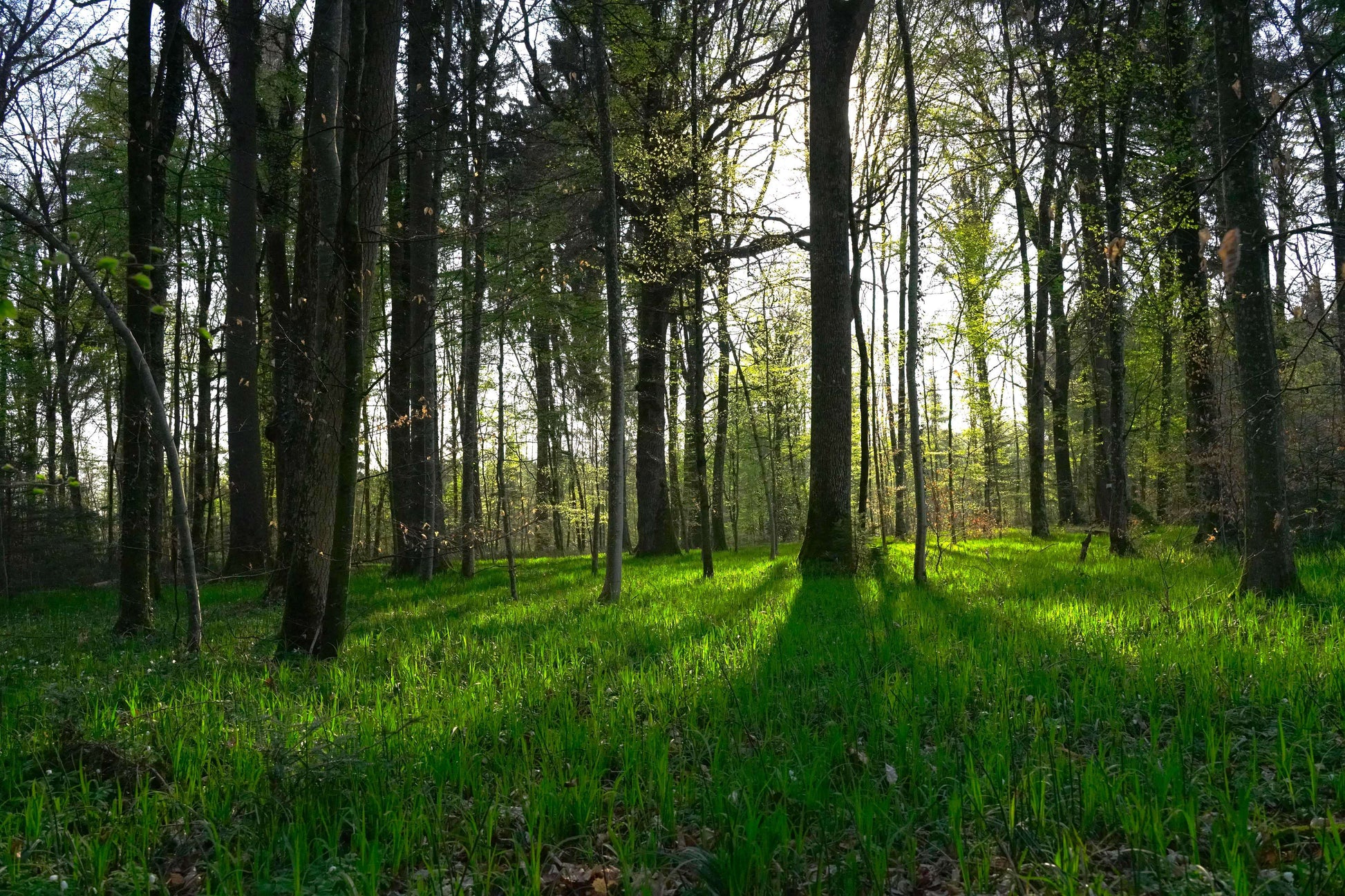 The vibrant green of new spring grass stretches out, interrupted only by the bold silhouettes of towering trees. Crisp sunlight filters through the canopy, speckling the verdant lawn with splashes of golden light.
